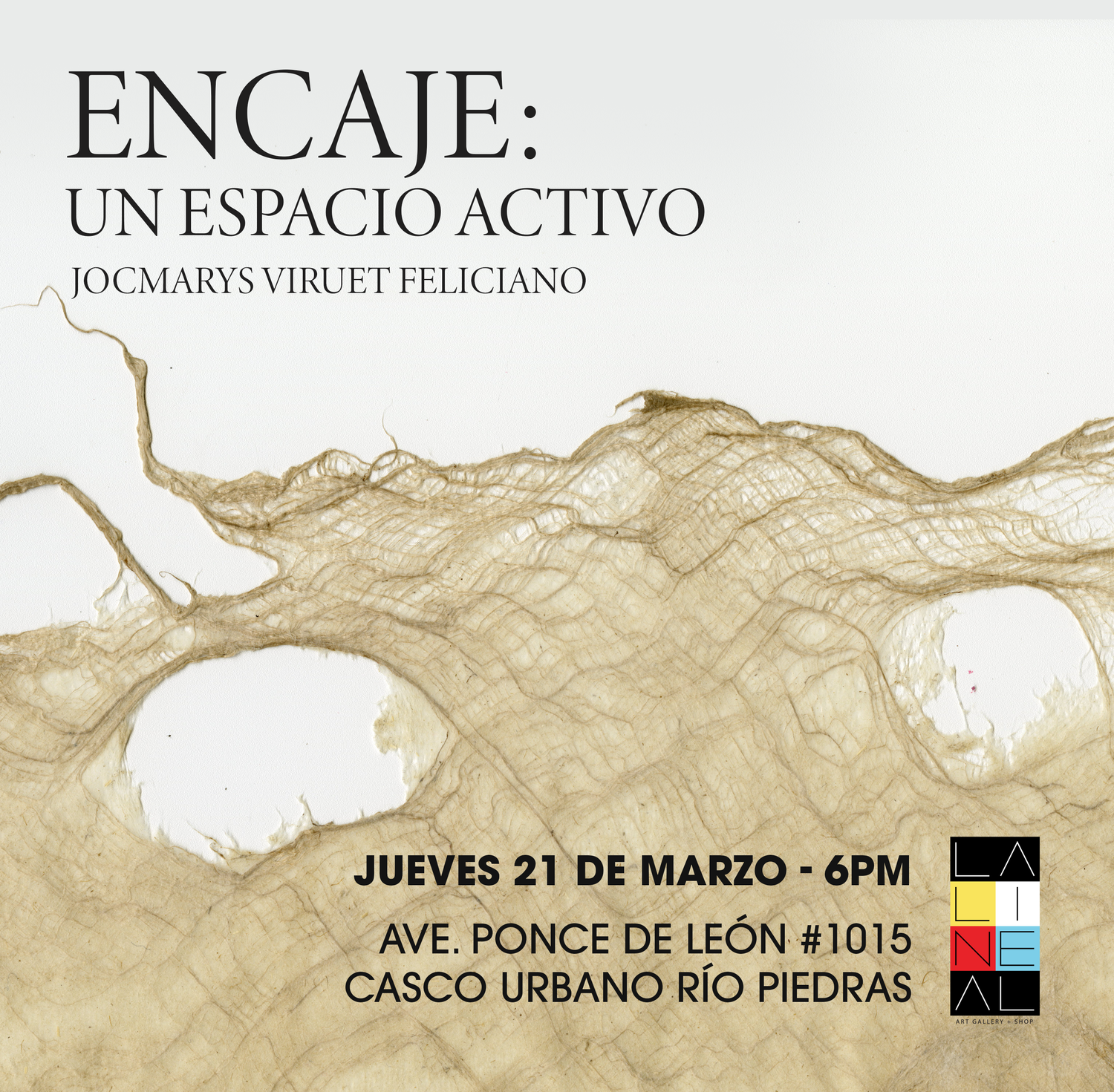 La muestra individual Encaje: Un espacio activo de Jocmarys Viruet Feliciano exalta la labor y versatilidad del papel hecho a mano. Las obras que se presentan están hechas con fibra que ha sido procesada desde el cultivo, cosecha, cocción, fermentación y manipulación hasta llegar a su estado siguiente como obra visual.