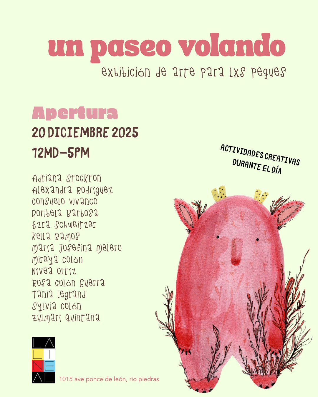 Una exposición colectiva que invita a artistas adultos a revisitar su niñez y a crear obras pensadas para ser vistas —literal y simbólicamente— a la altura de los niños. La muestra reúne piezas en diversos medios, desde pintura e ilustración hasta cerámica, piezas interactivas, todas desarrolladas desde recuerdos, pasatiempos, criaturas imaginarias y mundos secretos de la infancia.