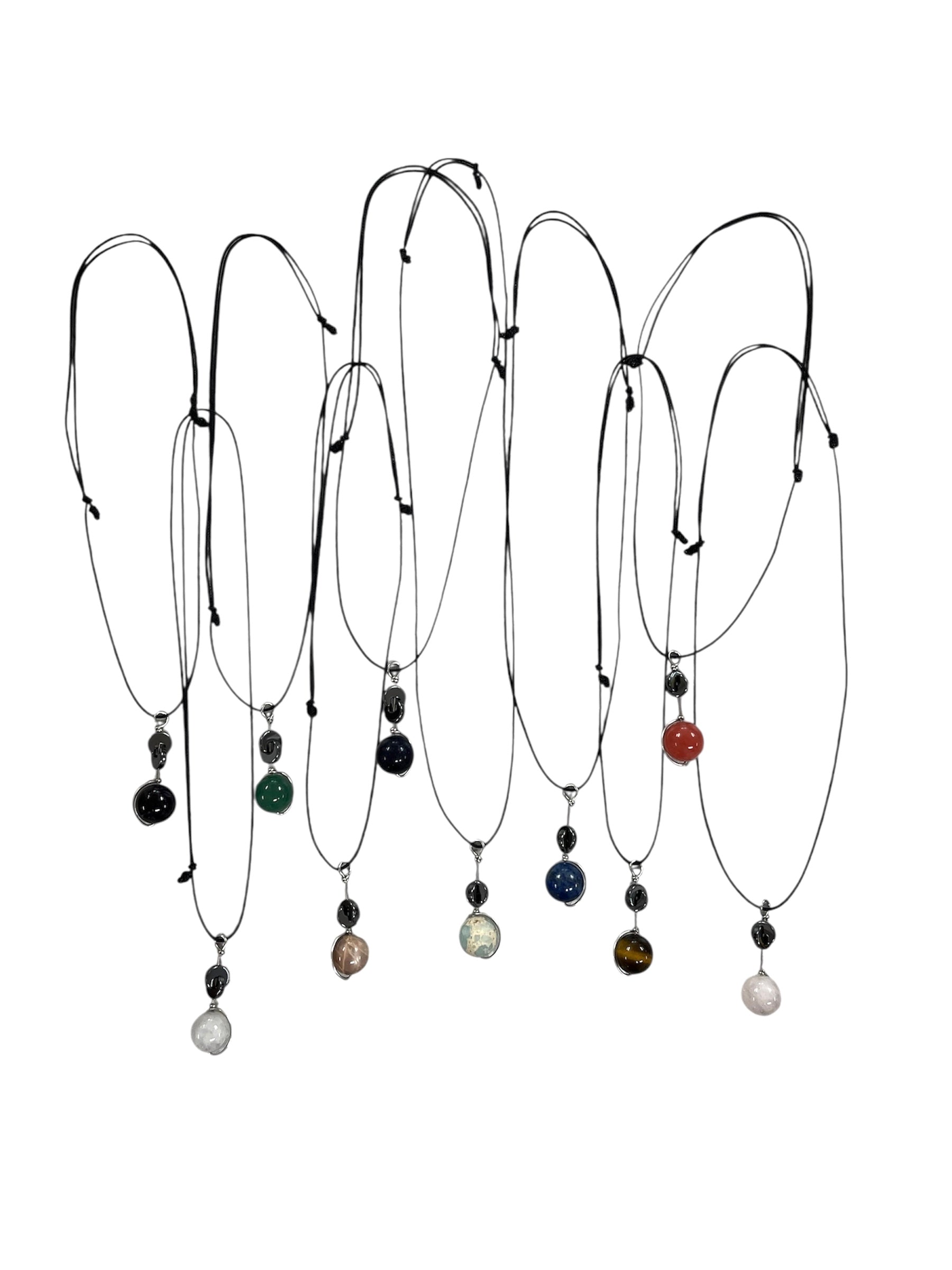 El collar está hecho de microparacord (¡muy resistente!) y cuenta con nudos móviles que se pueden utilizar para ajustar la longitud.
