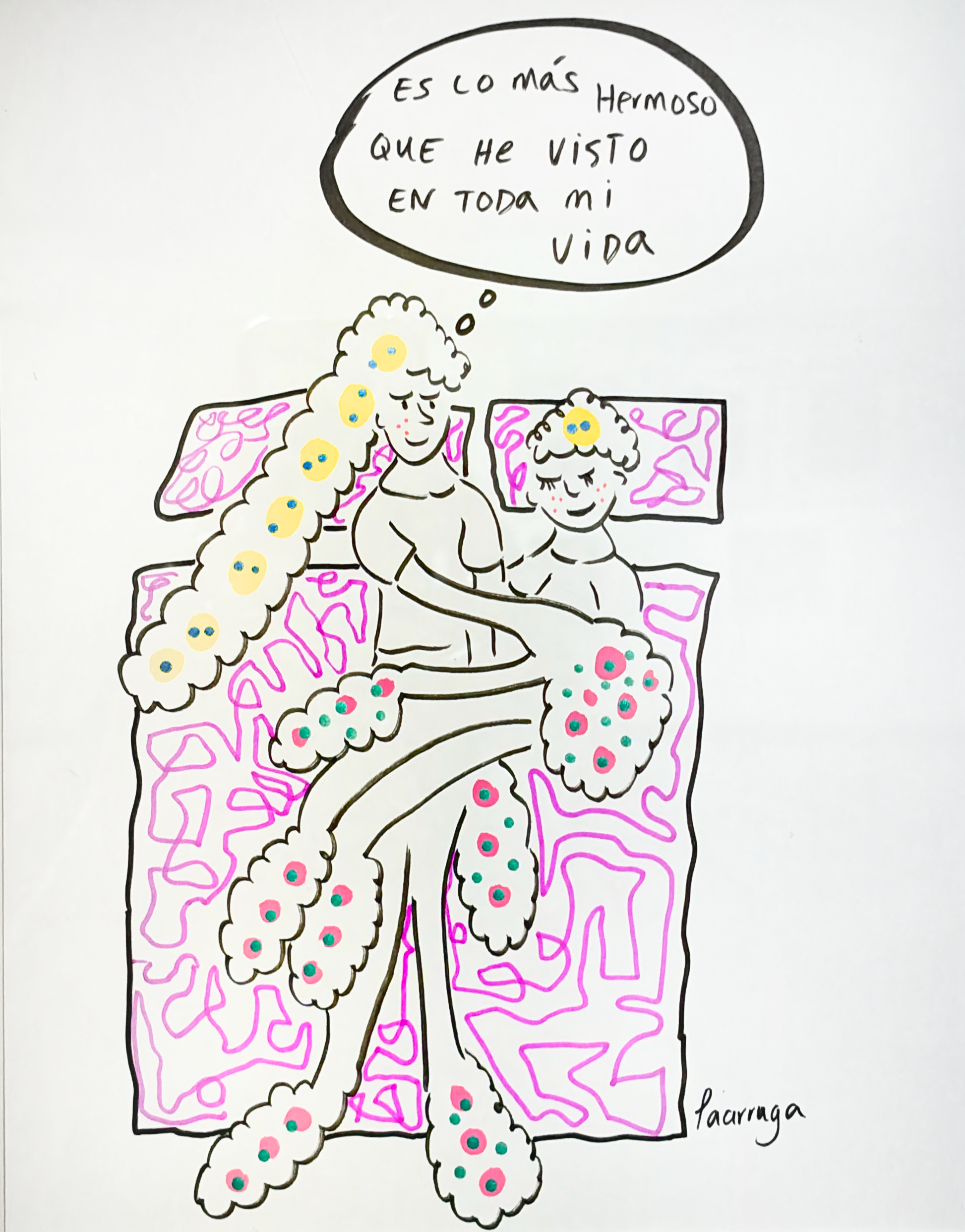 Dibujo Original con marcadores enmarcados en marco blanco.