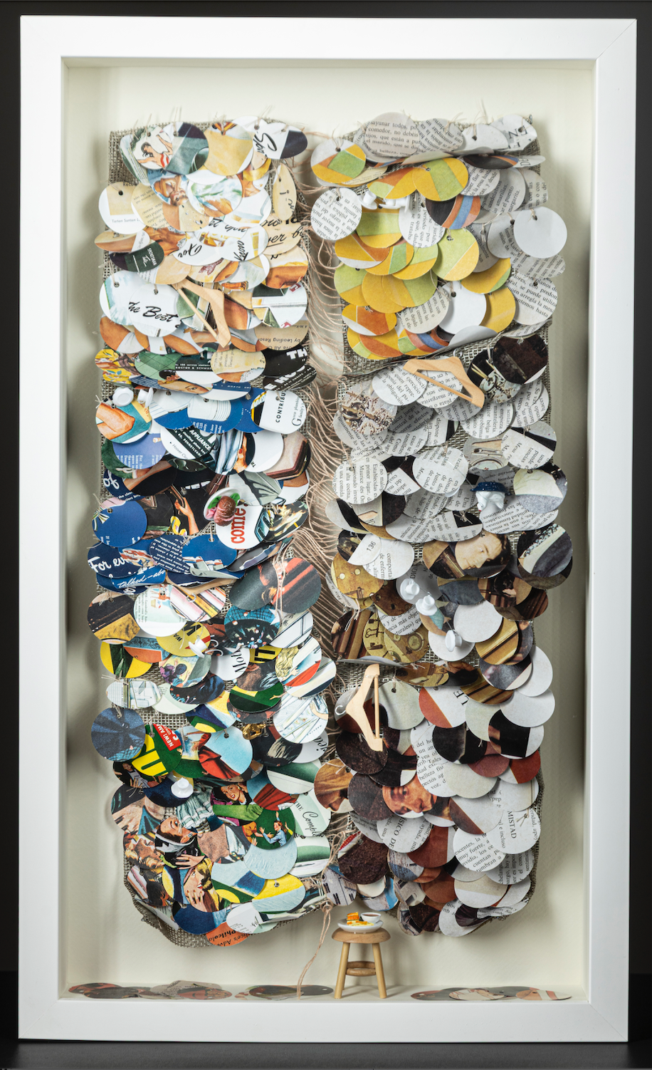 Con su trabajo lleva al espectador un mensaje de concienciación sobre el reciclaje del papel y otros materiales que de otra forma terminarían en la basura. Su obra crea imágenes deconstruidas y patrones de color sobre tela moldeada de manera orgánica que asemeja una piel forrada de escamas.